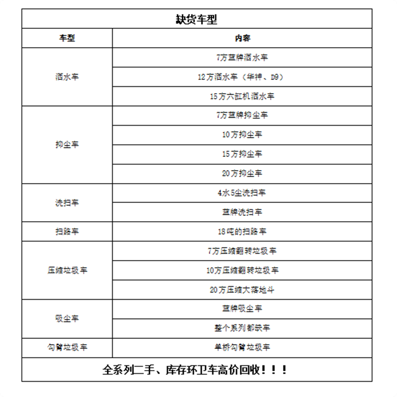 可租賃車型:全新或二手灑水車、洗掃車、清洗吸污車、高壓清洗車、吸糞車、掃路車、對接垃圾車、壓縮垃圾車、